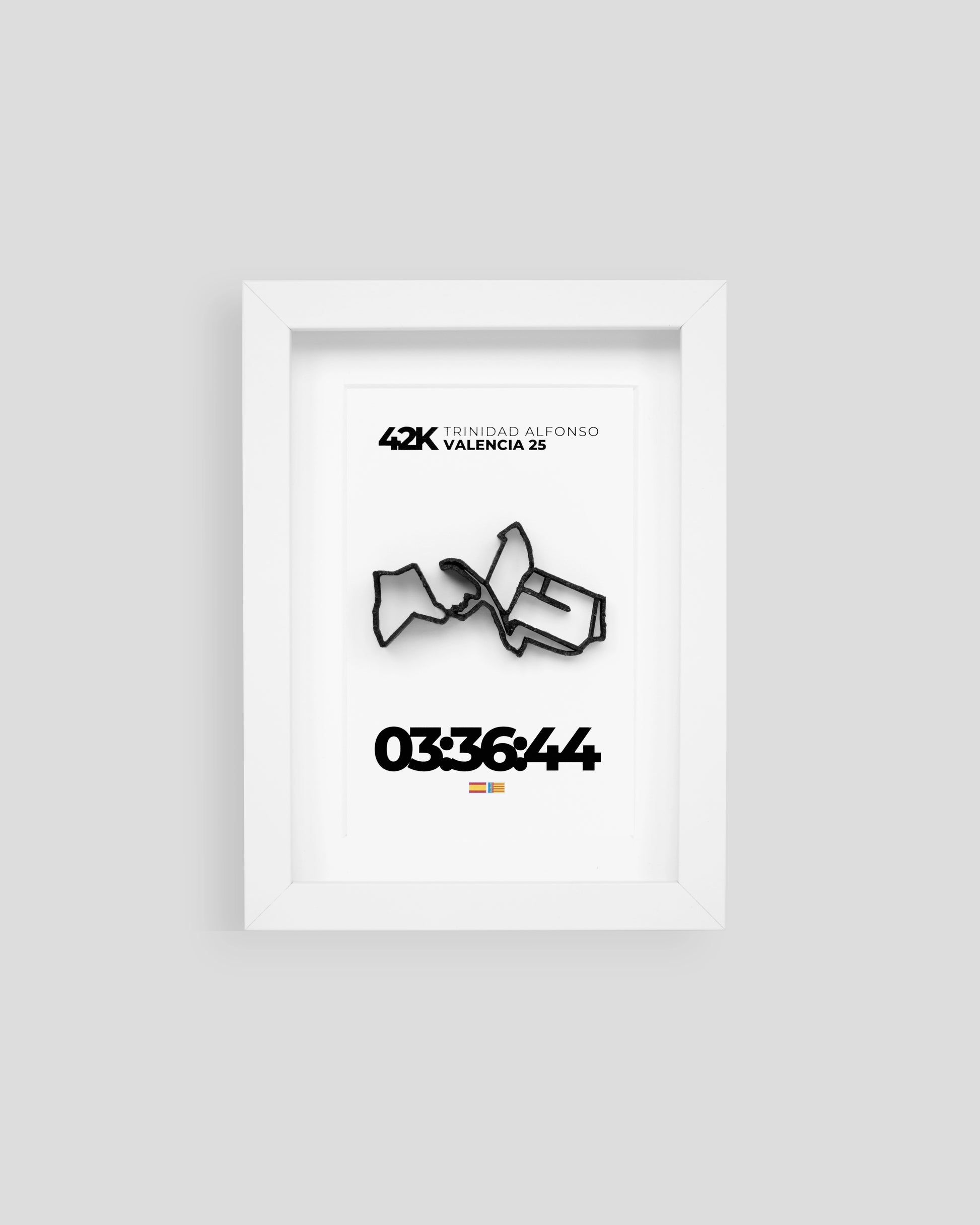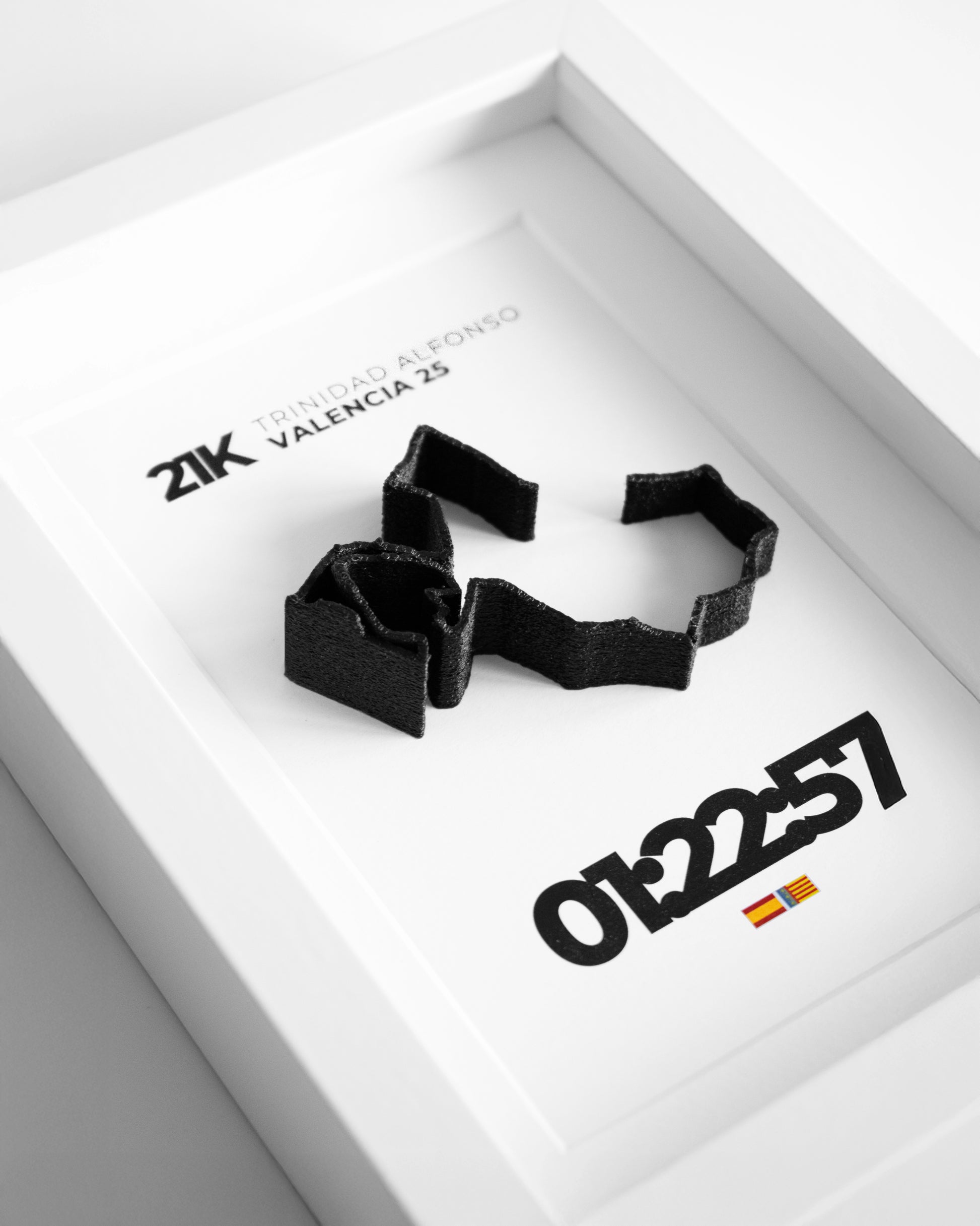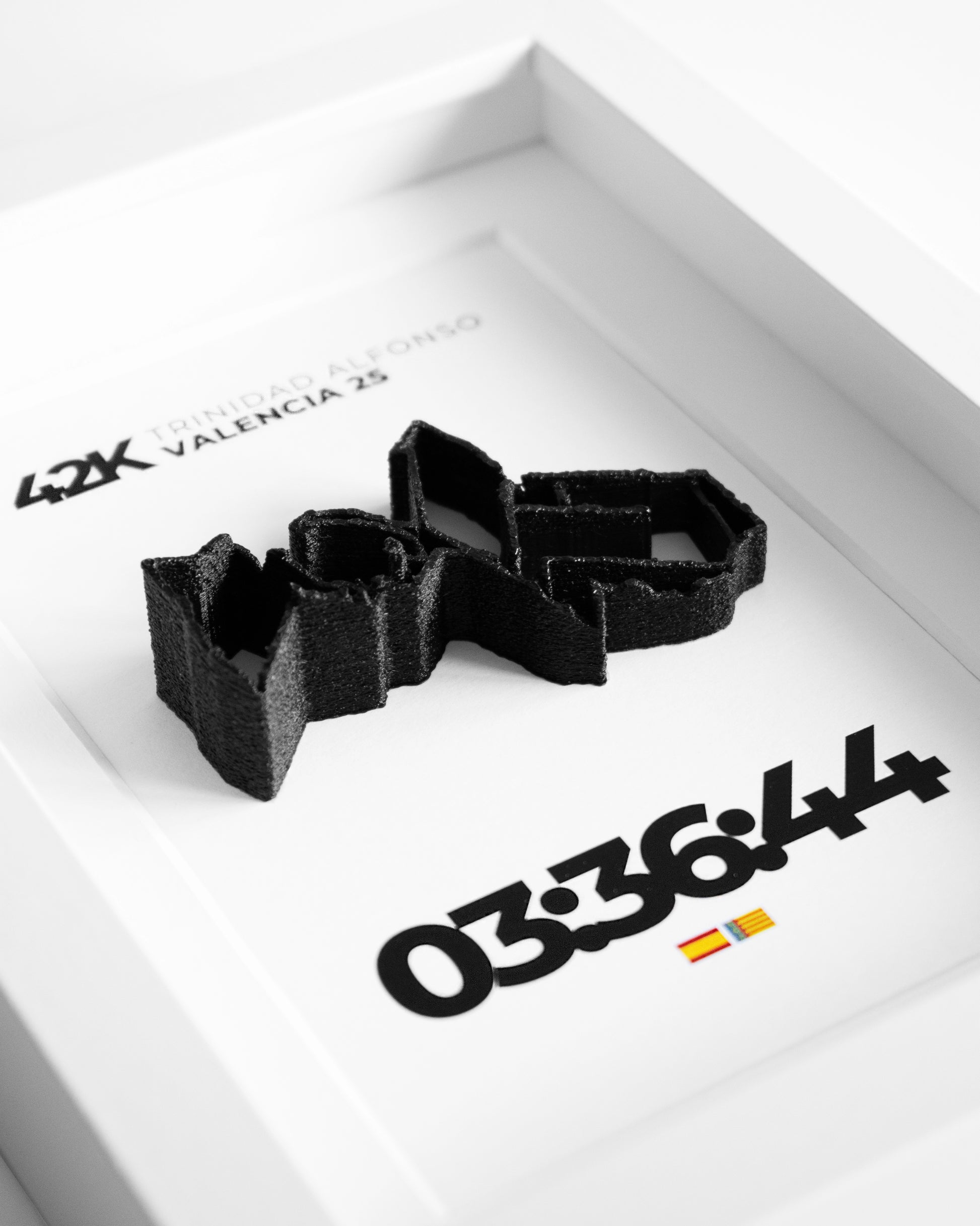 Celebra tu maratón en Valencia con un cuadro personalizado que refleja tu tiempo, nombre, ritmo y el recorrido completo en 3D. Cada detalle de tu esfuerzo, en una pieza visual única y sostenible.